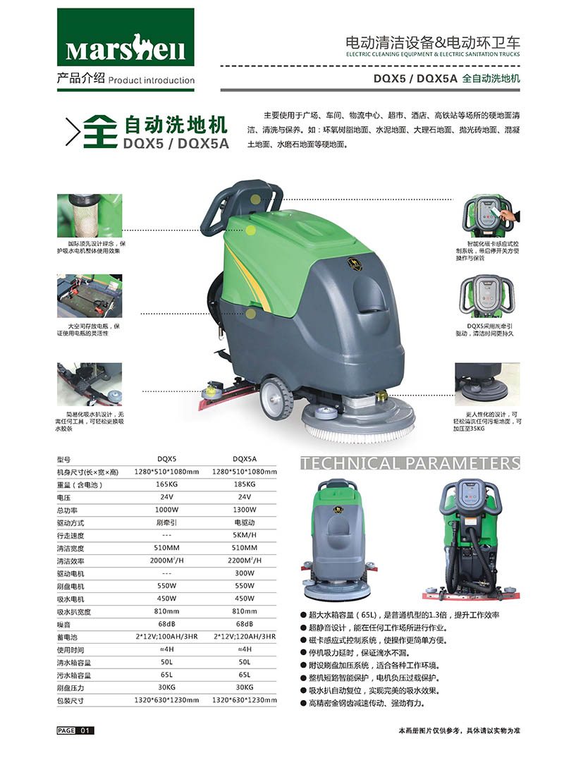 全自动电动洗地机DQX5A,主要适用于广场、车间、物流中心、超市、酒店、高铁站等场所的硬地面清洁、清洗与保养。如:环氧树脂地面、水泥地面、大理石地面、抛光砖地面、混泥土地面、和水磨石地面等硬质地面。