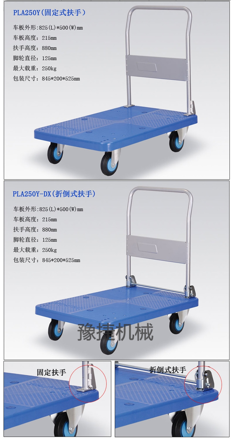 【华体会手机网页版-华体会(中国) 】平板手推车由塑料车板、粉体涂装扶手(可折倒、固定)、静脚轮(尼龙支架、铁板支架)等组成。