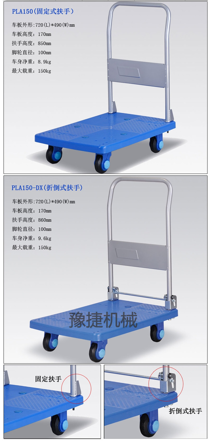 产品型号 | 最大 载重 | 车板 尺寸 | 车板 高度 | 扶手 高度 | 脚轮 尺寸 | 车身 净重 | 扶手 类型 |