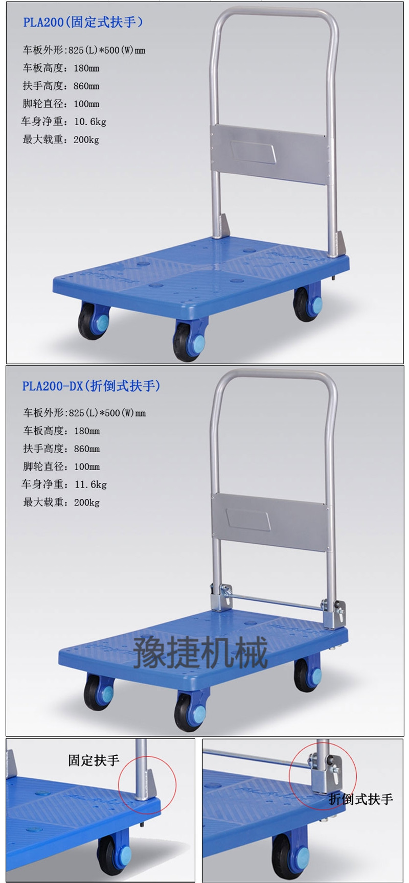 【华体会手机网页版-华体会(中国) 】平板手推车由塑料车板、粉体涂装扶手(可折倒、固定)、静脚轮(尼龙支架、铁板支架)等组成。