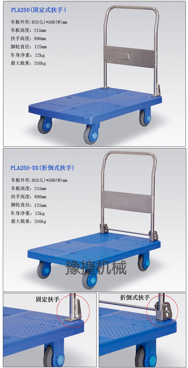【华体会手机网页版-华体会(中国) 】平板手推车由塑料车板、粉体涂装扶手(可折倒、固定)、静脚轮(尼龙支架、铁板支架)等组成。