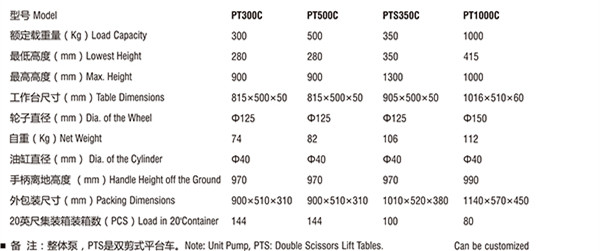 备注:整体泵,PTS是双剪式平台车 | ||||